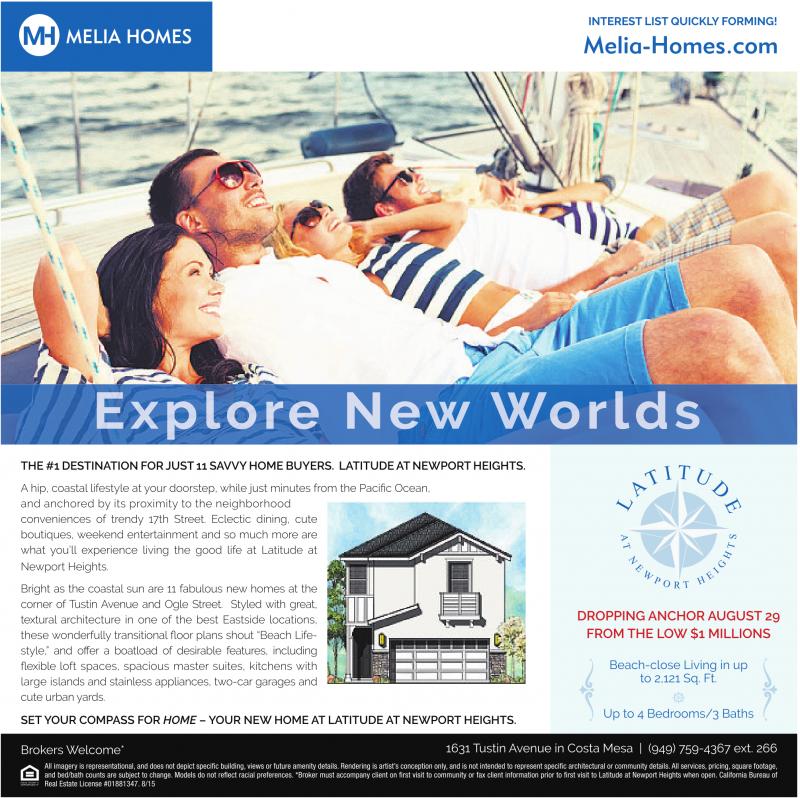 INTEREST LIST QUICKLY FORMING! Melia-Homes.com THE #1 DESTINATION FORJUST11 SAVVY HOME BUYERS. LATITUDE AT NEWPORTHEIGHTS. and anchored by its proximity to the neighborhood conveniences of trendy 17th Street. Eclectic dining, cute boutiques, weekend entertainment and so much more are what you’ll experience living the good life at Latitude at Newport Heights. Bright as the coastal sun are 11 fabulous new homes at the textural architecture in one of the best Eastside locations, - large islands and stainless appliances, two-car garages and cute urban yards. SET YOUR COMPASS FOR HOME – YOUR NEW HOME AT LATITUDE AT NEWPORT HEIGHTS. DROPPING ANCHOR AUGUST 29 FROM THE LOW $1 MILLIONS Beach-close Living in up to 2,121 Sq. Ft. Up to 4 Bedrooms/3 Baths Brokers Welcome* EQUAL HOUSIN GOPPORTUNI TY 1631 Tustin Avenue in Costa Mesa | (949) 759-4367 ext. 266 All imageryisrepresentational, and does not depict specific building, views or future amenity details. Rendering is artist’sconception only,and is not intended to represent specific architectural or community details. All services, pricing, square footage, and bed/bath counts are subject to change. Models do not reflect racial preferences. *Broker must accompany client on first visit to community or fax client information prior to first visit to Latitude at Newport Heights when open. California Bureau of Real Estate License #01881347. 8/15