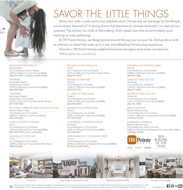 Plansand prices effectivedate of publicationand subject to change withoutnotice.Squarefootages areapproximate. Photos are of model homesand arefor illustrativepurposesonly. Modelsdonot reflect racial preference. *Brokermustaccompanyand register buyer on buyer’s firstvisit to the NewHomeGallery.Referral feepaiduponclose of escrow.TRI Pointe Communities, Inc. BRE 01888935.8/15