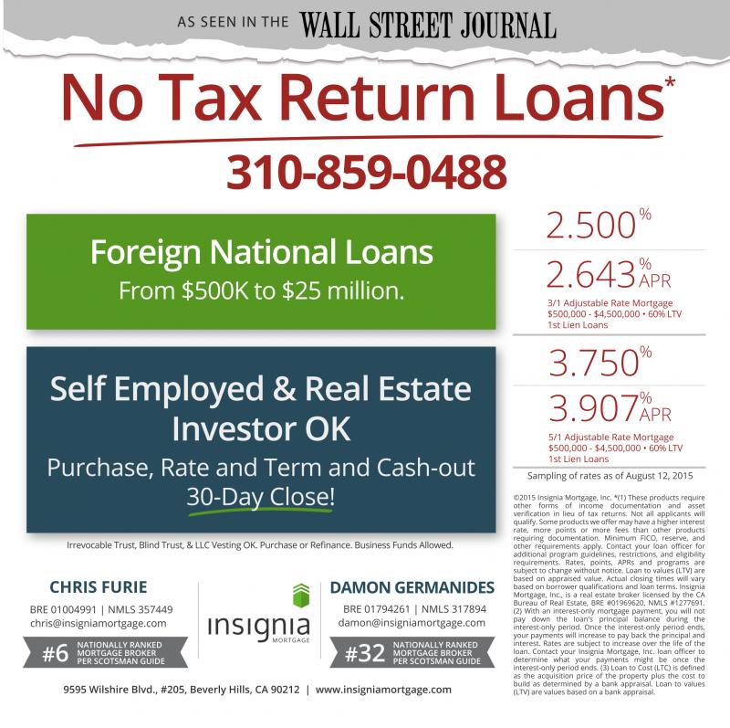 ©2015 Insignia Mortgage, Inc. *(1) These products require other forms of income documentation and asset verification in lieu of tax returns. Not all applicants will qualify. Some products we offer may have ahigher interest rate, more points or more fees than other products requiring documentation. Minimum FICO, reserve, and other requirements apply. Contact your loan officer for additional program guidelines, restrictions, and eligibility requirements. Rates, points, APRs and programs are subject to change without notice. Loan to values (LTV) are based on appraised value. Actual closing times will vary based on borrower qualifications and loan terms. Insignia Mortgage, Inc., is a real estate broker licensed by the CA Bureau of Real Estate, BRE #01969620, NMLS #1277691. (2) With an interest-only mortgage payment, you will not pay down the loan's principal balance during the interest-only period. Once the interest-only period ends, your payments will increase to pay back the principal and interest. Rates are subject to increase over the life of the loan. Contact your Insignia Mortgage, Inc. loan officer to determine what your payments might be once the interest-only period ends. (3) Loan to Cost (LTC) is defined as the acquisition price of the property plus the cost to build as determined by a bank appraisal. Loan to values (LTV) are values based on abank appraisal.