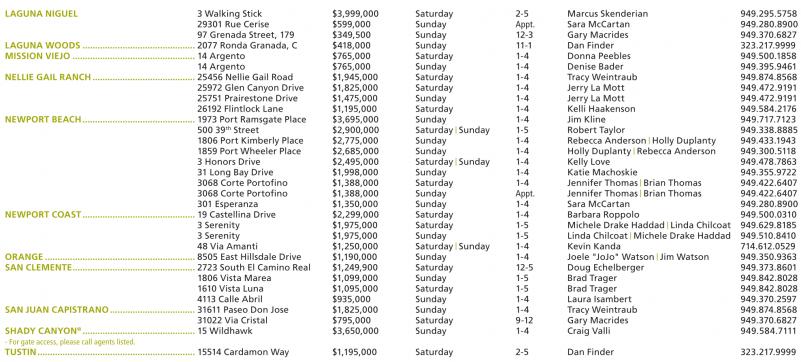 LAGUNA NIGUEL 3 Walking Stick $3,999,000 Saturday 2-5 Marcus Skenderian 949.295.5758 29301 Rue Cerise $599,000 Sunday Appt. Sara McCartan 949.280.8900 97 Grenada Street, 179 $349,500 Sunday 12-3 Gary Macrides 949.370.6827 LAGUNA WOODS............................................. 2077 Ronda Granada, C $418,000 Sunday 11-1 Dan Finder 323.217.9999 MISSION VIEJO ................................................. 14 Argento $765,000 Saturday 1-4 Donna Peebles 949.500.1858 14 Argento $765,000 Sunday 1-4 Denise Bader 949.395.9461 NELLIE GAIL RANCH......................................... 25456 Nellie Gail Road $1,945,000 Saturday 1-4 Tracy Weintraub 949.874.8568 25972 Glen Canyon Drive $1,825,000 Saturday 1-4 Jerry La Mott 949.472.9191 25751 Prairestone Drive $1,475,000 Sunday 1-4 Jerry La Mott 949.472.9191 26192 Flintlock Lane $1,195,000 Saturday 1-4 Kelli Haakenson 949.584.2176 NEWPORT BEACH............................................. 1973 Port Ramsgate Place $3,695,000 Sunday 1-4 Jim Kline 949.717.7123 500 39 th Street $2,900,000 Saturday | Sunday 1-5 Robert Taylor 949.338.8885 1806 Port Kimberly Place $2,775,000 Sunday 1-4 Rebecca Anderson | Holly Duplanty 949.433.1943 1859 Port Wheeler Place $2,685,000 Sunday 1-4 Holly Duplanty | Rebecca Anderson 949.300.5118 3 Honors Drive $2,495,000 Saturday | Sunday 1-4 Kelly Love 949.478.7863 31 Long Bay Drive $1,998,000 Sunday 1-4 Katie Machoskie 949.355.9722 3068 Corte Portofino $1,388,000 Saturday 1-4 Jennifer Thomas | Brian Thomas 949.422.6407 3068 Corte Portofino $1,388,000 Sunday Appt. Jennifer Thomas | Brian Thomas 949.422.6407 301 Esperanza $1,350,000 Sunday 1-4 Sara McCartan 949.280.8900 NEWPORT COAST............................................. 19 Castellina Drive $2,299,000 Saturday 1-4 Barbara Roppolo 949.500.0310 3 Serenity $1,975,000 Saturday 1-5 Michele Drake Haddad | Linda Chilcoat 949.629.8185 3 Serenity $1,975,000 Sunday 1-5 Linda Chilcoat | Michele Drake Haddad 949.510.8410 48 Via Amanti $1,250,000 Saturday | Sunday 1-4 Kevin Kanda 714.612.0529 ORANGE ............................................................ 8505 East Hillsdale Drive $1,190,000 Sunday 1-4 Joele "JoJo" Watson | Jim Watson 949.350.9363 SAN CLEMENTE................................................. 2723 South El Camino Real $1,249,900 Saturday 12-5 Doug Echelberger 949.373.8601 1806 Vista Marea $1,099,000 Sunday 1-5 Brad Trager 949.842.8028 1610 Vista Luna $1,095,000 Saturday 1-5 Brad Trager 949.842.8028 4113 Calle Abril $935,000 Sunday 1-4 Laura Isambert 949.370.2597 SAN JUAN CAPISTRANO.................................. 31611 Paseo Don Jose $1,825,000 Sunday 1-4 Tracy Weintraub 949.874.8568 31022 Via Cristal $795,000 Saturday 9-12 Gary Macrides 949.370.6827 SHADY CANYON ® ............................................. 15 Wildhawk $3,650,000 Sunday 1-4 Craig Valli 949.584.7111 -For gate access,pleasecallagentslisted. TUSTIN............................................................... 15514 Cardamon Way $1,195,000 Saturday 2-5 Dan Finder 323.217.9999