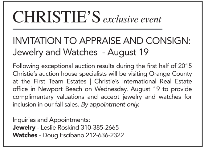 Following exceptional auction results during the first half of 2015 Christie’s auction house specialists will be visiting Orange County at the First Team Estates | Christie’s International Real Estate office in Newport Beach on Wednesday, August 19 to provide complimentary valuations and accept jewelry and watches for inclusion in our fallsales. By appointment only.
