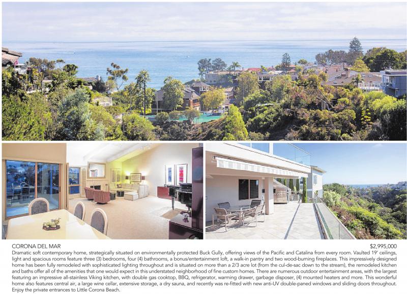 CORONA DEL MAR $2,995,000 Dramatic soft contemporary home, strategically situated on environmentally protected Buck Gully, offering views of the Pacific and Catalina from every room. Vaulted 19’ ceilings, light and spacious rooms feature three (3) bedrooms, four (4) bathrooms, a bonus/entertainment loft, a walk-in pantry and two wood-burning fireplaces. This impressively designed home has been fully remodeled with sophisticated lighting throughout and is situated on more than a 2/3 acre lot (from the cul-de-sac down to the stream), the remodeled kitchen andbaths offer all of theamenities thatone would expect in thisunderstatedneighborhoodoffine customhomes. There are numerous outdoor entertainment areas,withthe largest featuring an impressive all-stainless Viking kitchen, with double gas cooktop, BBQ, refrigerator, warming drawer, garbage disposer, (4) mounted heaters and more. This wonderful home also features central air, a large wine cellar, extensive storage, a dry sauna, and recently was re-fitted with new anti-UV double-paned windows and sliding doors throughout. Enjoy the private entrances to Little Corona Beach.