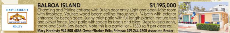 MARYHARDESTY REALTY BALBOA ISLAND $1,195,000 C w ea s M Charming and Pristine cottage with Dutch door entry. Light and open living room with fireplace. Vaulted wood beam ceiling throughout. ¾ bath with exterior entrance for beach goers. Sunny brick patio with full length planter, mature tree and picket fence. Back patio with space for boats and bikes. Steps to restaurants, shops and South Bay Beach. Note this is a partial lot – 1380 sq ft per assessor. Mary Hardesty 949-500-4866 Owner/Broker Erika Primeau 949-244-9205 Associate Broker