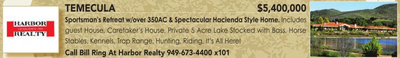 TEMECULA $5,400,000 S Sportsman’s Retreat w/over 350AC & Spectacular Hacienda Style Home. Includes guest House, Caretaker’s House, Private 5 Acre Lake Stocked with Bass, Horse g Stables, Kennels, Trap Range, Hunting, Riding, It’s All Here! Call Bill Ring At Harbor Realty 949-673-4400 x101