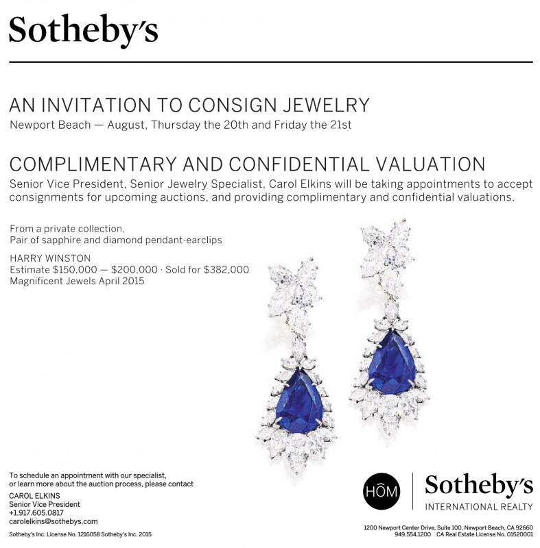 AN INVITATION TO CONSIGN JEWELRY Newport Beach — August, Thursday the 20th and Friday the 21st COMPLIMENTARY AND CONFIDENTIAL VALUATION ATION Senior Vice President, Senior Jewelry elry Specialist, ist, Carol Elkins will be taking appointments to accept consignments for upcoming auctions, and providing complimentary and confidential valuations. ations. From a private collection, Pair of sapphire and diamond pendant-earclips HARRY WINSTON Estimate $150,000 0 — $200,000 · Sold for $382,000 0 Magnificent Jewels April 2015 To schedule an appointment with our specialist, or learn more about the auction process, please contact CAROL ELKINS Senior Vice President +1.917.605.0817 carolelkins@sothebys.com Sotheby's Inc. License No. 1216058 Sotheby's Inc. 2015 1200 Newport Center Drive, Suite 100, Newport Beach, CA 92660 949.554.1200 CA Real Estate License No. 01520001