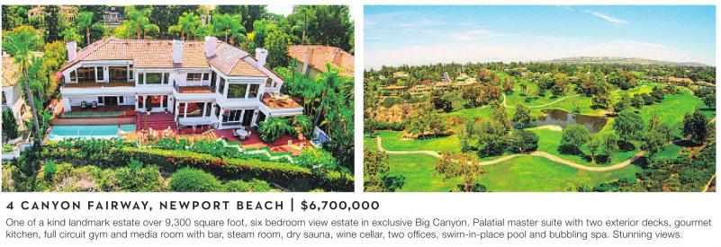 4 CANYON FAIRWAY, NEWPORT BEACH | $6,700,000 One of a kind landmark estate over 9,300 square foot, six bedroom view estate in exclusive Big Canyon. Palatial master suite with two exterior decks, gourmet kitchen, full circuit gym and media room with bar, steam room, dry sauna, wine cellar, two offices, swim-in-place pool and bubbling spa. Stunning views.