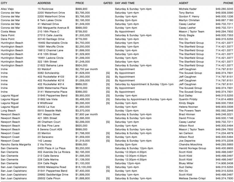 Aliso Viejo 15 Rockrose $999,900 Saturday & Sunday 1pm-4pm Michele Kader 949.280.3245 Corona del Mar 2200 Waterfront Drive $3,795,000 Saturday 1pm-4pm Tony Bartos 949.939.3390 Corona del Mar 2200 Waterfront Drive $3,795,000 Sunday 1pm-4pm Gordon F. Henry 949.500.1236 Corona del Mar 8 Twin Lakes Circle $2,195,000 Sunday 2pm-5pm Marilyn Christian 949.887.7160 Corona del Mar 41 Mainsail Drive $1,349,000 Saturday 1pm-4pm Casey Lesher 949.702.7211 Corona del Mar 330 Marguerite Avenue B $999,000 Sunday 1pm-4pm Casey Lesher 949.702.7211 Costa Mesa 210 16th Place C $739,500 By Appointment Mason | Taylor Team 949.294.7832 Dana Point 27015 Calle Juanita $1,500,000 Saturday & Sunday 1pm-4pm Kindy Slagle 949.500.7353 Dana Point 33140 Santiago Drive $779,000 Saturday 1pm-4pm Kim Do 949.315.5255 Huntington Beach 16482 Barnstable Circle $4,750,000 Saturday 1pm-5pm The Stanfield Group 714.421.3377 Huntington Beach 16381 Maruffa Circle $2,250,000 Saturday 1pm-5pm The Stanfield Group 714.421.3377 Huntington Beach 16612 Channel Lane $1,699,000 Sunday 1pm-4pm The Stanfield Group 714.421.3377 Huntington Beach 416 10th Street $1,329,900 Saturday 1pm-4pm The Stanfield Group 714.421.3377 Huntington Beach 16461 Ladona Circle $1,299,000 Sunday 1pm-4pm The Stanfield Group 714.421.3377 Huntington Beach 322 18th Street $1,248,000 Saturday 1pm-4pm The Stanfield Group 714.421.3377 Huntington Beach 21622 Bahama Lane $924,000 Saturday & Sunday 1pm-4pm The Stanfield Group 714.421.3377 Irvine 53 Waldorf $2,750 per month By Appointment Jeff Caughren 714.797.6151 Irvine 3082 Scholarship $1,628,000 [G] By Appointment The Soussé Group 949.374.7831 Irvine 402 Rockefeller #103 $1,350,000 [G] By Appointment Jeff Caughren 714.797.6151 Irvine 402 Rockefeller #216 $1,059,000 [G] By Appointment Jeff Caughren 714.797.6151 Irvine 402 Rockefeller #314 $869,000 [G] Saturday by Appointment & Sunday 12pm-1pm Jeff Caughren 714.797.6151 Irvine 3265 Watermarke Place $618,000 [G] By Appointment The Soussé Group 949.374.7831 Irvine 3141 Watermarke Place $368,000 [G] By Appointment The Soussé Group 949.374.7831 Laguna Niguel 31645 Peppertree Bend $9,950,000 [G] Sunday 1pm-4pm Suzi Dailey 949.315.5255 Laguna Niguel 31662 Isle Vista $5,488,000 [G] Saturday by Appointment & Sunday 1pm-4pm Quentin Priddy 714.814.4663 Laguna Niguel 9 Wildflower $5,295,000 [G] Sunday 1pm-4pm Kindy Slagle 949.500.7353 Laguna Niguel 30432 La Vue $1,350,000 Sunday 1pm-4pm Helena Noonan 949.903.0306 Long Beach 5915 Seaside Walk $3,370,000 Sunday 12pm-4pm The Powers Team 562.592.2946 Newport Beach 807 Aleppo Street $7,900 per month Saturday & Sunday 1pm-4pm Brad Hinman 949.246.3221 Newport Beach 421 38th Street $2,395,000 Saturday & Sunday 1pm-4pm David Prince 949.500.1746 Newport Beach 26 Chatham Court $2,299,000 [G] Saturday 1pm-4pm Casey Lesher 949.702.7211 Newport Beach 60 Sea Pine Lane $825,000 Sunday 1pm-4pm Allison Root 949.300.5484 Newport Beach 8 Serena Court #29 $699,000 Saturday & Sunday 1pm-4pm Mason | Taylor Team 949.294.7832 Newport Coast 20 Menton $1,798,000 [G] Saturday & Sunday 1pm-4pm Ian Carlson 714.234.4879 Newport Coast 23 Saraceno $1,359,000 [G] Sunday 1pm-4pm Allison Root 949.300.5484 Newport Coast 142 Lessay $1,319,000 [G] Saturday & Sunday 1pm-4pm Joe Deperine 949.375.2208 Rancho Santa Margarita 2 Via Floria $599,000 Sunday 2pm-5pm Chandra Moschina 949.293.5883 San Clemente 2405 Plaza A La Playa $3,250,000 Saturday & Sunday 12pm-3pm Harold Noriega Group 949.400.9905 San Clemente 302 Avenida De La Riviera $2,195,000 Sunday 12:30pm-4:30pm Scott Kidd 949.498.0487 San Clemente 213 Calle Serena $1,595,000 Sunday 12:30pm-4:30pm Scott Kidd 949.498.0487 San Clemente 228 Calle Marina $1,139,000 Sunday 12:30pm-4:30pm Scott Kidd 949.498.0487 San Clemente 204 Calle Regla $1,100,000 Saturday 12pm-4pm Bluey Miller 714.906.3438 San Juan Capistrano 30302 Malaspina Road $13,100,000 [G] Saturday 1pm-4pm Suzi Dailey 949.315.5255 San Juan Capistrano 31541 Peppertree Bend $7,400,000 [G] Sunday 1pm-4pm Kim Do 949.315.5255 San Juan Capistrano 29982 Saddleridge Drive $1,899,000 Saturday 1pm-4pm Scott Kidd 949.498.0487 San Juan Capistrano 28502 Calle Pinon $1,688,800 [G] Saturday & Sunday 1pm-4pm Melissa Davies-Crispi 949.374.7830