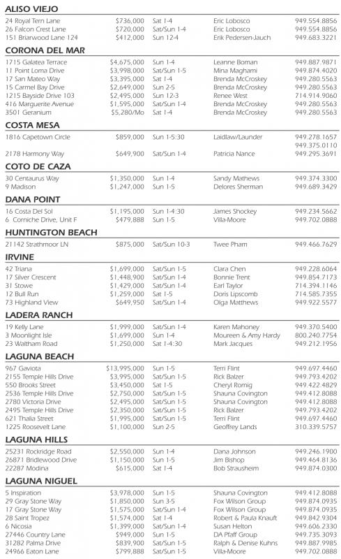 ALISO VIEJO 24 Royal Tern Lane $736,000 Sat 1-4 Eric Lobosco 949.554.8856 26 Falcon Crest Lane $720,000 Sat/Sun 1-4 Eric Lobosco 949.554.8856 151 Briarwood Lane 124 $412,000 Sun 12-4 Erik Pedersen-Jauch 949.683.3221 CORONA DEL MAR 1715 Galatea Terrace $4,675,000 Sun 1-4 Leanne Boman 949.887.9871 11 Point Loma Drive $3,998,000 Sat/Sun 1-5 Mina Maghami 949.874.4020 17 San Mateo Way $3,395,000 Sat 1-4 Brenda McCroskey 949.280.5563 15 Carmel Bay Drive $2,649,000 Sun 2-5 Brenda McCroskey 949.280.5563 1215 Bayside Drive 103 $2,495,000 Sun 12-3 Renee West 714.914.9060 416 Marguerite Avenue $1,595,000 Sat/Sun 1-4 Brenda McCroskey 949.280.5563 3501 Geranium $5,280/Mo Sat 1-4 Brenda McCroskey 949.280.5563 COSTA MESA 1816 Capetown Circle $859,000 Sun 1-5:30 Laidlaw/Launder 949.278.1657 949.375.0110 2178 Harmony Way $649,900 Sat/Sun 1-4 Patricia Nance 949.295.3691 COTO DE CAZA 30 Centaurus Way $1,350,000 Sun 1-4 Sandy Mathews 949.374.3300 9Madison $1,247,000 Sun 1-5 Delores Sherman 949.689.3429 DANA POINT 16 Costa Del Sol $1,195,000 Sun 1-4:30 James Shockey 949.234.5662 6 Corniche Drive, Unit F $479,888 Sun 1-5 Villa-Moore 949.702.0888 HUNTINGTON BEACH 21142 Strathmoor LN $875,000 Sat/Sun 10-3 Twee Pham 949.466.7629 IRVINE 42 Triana $1,699,000 Sat/Sun 1-5 Clara Chen 949.228.6064 17 Silver Crescent $1,448,900 Sat/Sun 1-4 Bonnie Trent 949.854.7173 31 Stowe $1,429,000 Sat/Sun 1-4 Earl Taylor 714.394.1146 12 Bull Run $1,259,000 Sat 1-5 Doris Lipscomb 714.585.7355 73 Highland View $649,950 Sat/Sun 1-4 Olga Matthews 949.922.5577 LADERA RANCH 19 Kelly Lane $1,999,000 Sat/Sun 1-4 Karen Mahoney 949.370.5400 3Moonlight Isle $1,699,000 Sun 1-4 Moureen &Amy Hardy 800.240.7754 23 Waltham Road $1,250,000 Sat 1-4:30 Mark Jacques 949.212.1956 LAGUNA BEACH 967 Gaviota $13,995,000 Sun 1-5 Terri Flint 949.697.4460 2155 Temple Hills Drive $3,995,000 Sat/Sun 1-5 Rick Balzer 949.793.4202 550 Brooks Street $3,450,000 Sat 1-5 Cheryl Romig 949.422.4829 2536 Temple Hills Drive $2,750,000 Sat/Sun 1-5 Shauna Covington 949.412.8088 2780 Victoria Drive $2,495,000 Sat/Sun 1-5 Shauna Covington 949.412.8088 2495 Temple Hills Drive $2,350,000 Sat/Sun 1-5 Rick Balzer 949.793.4202 621 Thalia Street $1,995,000 Sat/Sun 1-5 Terri Flint 949.697.4460 1225 Roosevelt Lane $1,100,000 Sun 2-5 Geoffrey Lands 310.339.5757 LAGUNA HILLS 25231 Rockridge Road $2,550,000 Sun 1-4 Dana Johnson 949.246.1900 26871 Bridlewood Drive $1,150,000 Sun 1-5 Jim Bishop 949.464.8136 22287 Modina $615,000 Sat 1-4 Bob Strausheim 949.874.0300 LAGUNA NIGUEL 5Inspiration $3,978,000 Sun 1-5 Shauna Covington 949.412.8088 29 Gray Stone Way $1,850,000 Sun 3-5 Fox Wilson Group 949.874.0935 17 Gray Stone Way $1,575,000 Sat/Sun 1-4 Fox Wilson Group 949.874.0935 28 Saint Tropez $1,574,000 Sat 1-4 Robert &Paula Knauft 949.842.9304 6Nicosia $1,399,000 Sat/Sun 1-4 Susan Helton 949.606.2330 27446 Country Lane $949,000 Sun 1-5 DA Pfaff Group 949.735.3093 31282 Palma Drive $839,900 Sat/Sun 1-5 Ralph &Denise Kuhns 949.887.9985 24966 Eaton Lane $799,888 Sat/Sun 1-5 Villa-Moore 949.702.0888