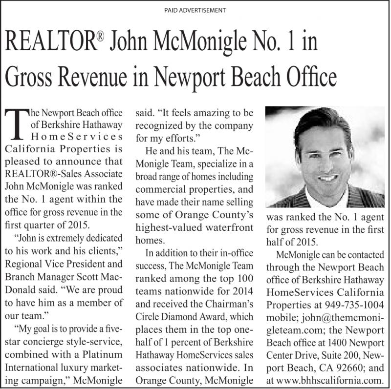 John McMonigle No. 1 in Gross Revenue in Newport Beach Office