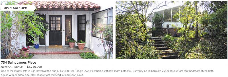 NEWPORT BEACH | $2,250,000 One of the largest lots in Cliff Haven at the end of a cul-de-sac. Single level view home with lots more potential. Currently an immaculate 2,200 square foot four bedroom, three bath house with enormous 17,000+ square foot terraced lot and sport court.