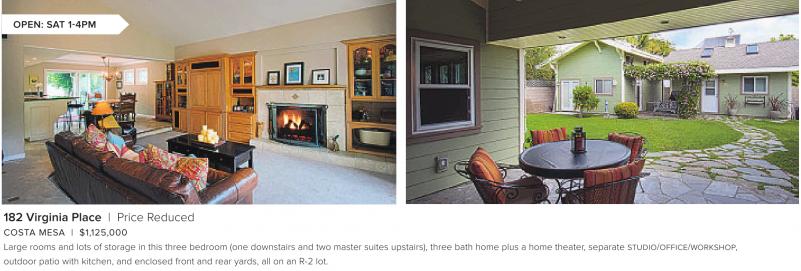 OPEN: SAT 1-4PM 182 Virginia Place | Price Reduced COSTA MESA | $1,125,000 Large rooms and lots of storage in this three bedroom (one downstairs and two master suites upstairs), three bath home plus a home theater, separate STUDIO/OFFICE/WORKSHOP, outdoor patio with kitchen, and enclosed front and rear yards, all on an R-2 lot. See also