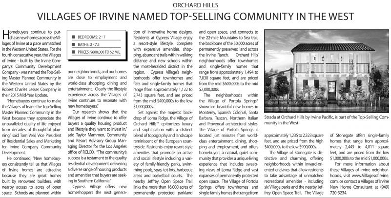“Homebuyers continue to make theVillages of Irvine the Top-Selling master Planned community in the West because they appreciate the unparalleled quality of life enjoyed from decades of thoughtful planning,” said Tom Veal, Vice President of residential Sales and marketing for Irvine company community Development.