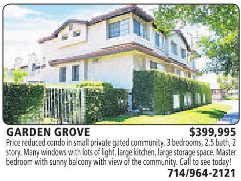 GARDEN GROVE $399,995 Price reducedcondo in small privategated community. 3bedrooms, 2.5bath, 2story. Manywindows with lots of light, large kitchen, large storagespace.Master bedroomwithsunnybalcony with view of thecommunity.Calltosee today! 714/964-2121