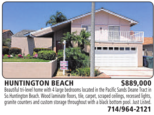 HUNTINGTON BEACH $889,000 Beautiful tri-level home with 4large bedrooms located inthe Pacific Sands Deane Tract in So.Huntington Beach. Wood laminate floors, tile, carpet, scraped ceilings, recessed lights, granite counters and custom storage throughout with ablack bottom pool. Just Listed. 714/964-2121