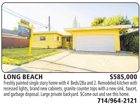LONG BEACH $585,000 Freshlypainted single storyhome with 4 Beds/2Ba and2.Remodeledkitchen with recessedlights, brand newcabinets, granitecountertopswithanew sink,faucet, and garbage disposal. Large private backyard. $Come outand seethis home. 714/964-2121