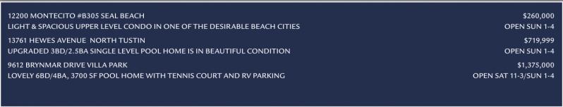 12200MONTECITO #B305SEALBEACH $260,000 LIGHT&SPACIOUSUPPER LEVEL CONDO IN ONEOFTHE DESIRABLEBEACH CITIES OPEN SUN 1-4 13761HEWES AVENUE NORTH TUSTIN $719,999 UPGRADED 3BD/2.5BASINGLELEVEL POOL HOME IS IN BEAUTIFULCONDITION OPEN SUN 1-4 9612 BRYNMARDRIVE VILLAPARK $1,375,000 LOVELY6BD/4BA,3700SFPOOL HOMEWITH TENNIS COURTAND RV PARKING OPEN SAT 11-3/SUN 1-4