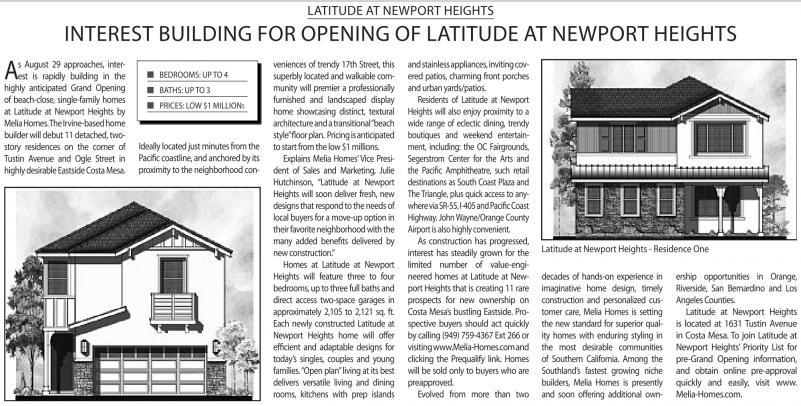 As construction has progressed, interest has steadily grown for the limited number of value-engineered homes at Latitude at Newport Heights thatiscreating 11 rare prospects for new ownership on Costa Mesa’s bustling Eastside.prospective buyers should act quickly by calling (949) 759-4367 Ext266 or visitingwww.Melia-Homes.comand clicking the prequalify link. Homes will be sold only to buyers who are preapproved.