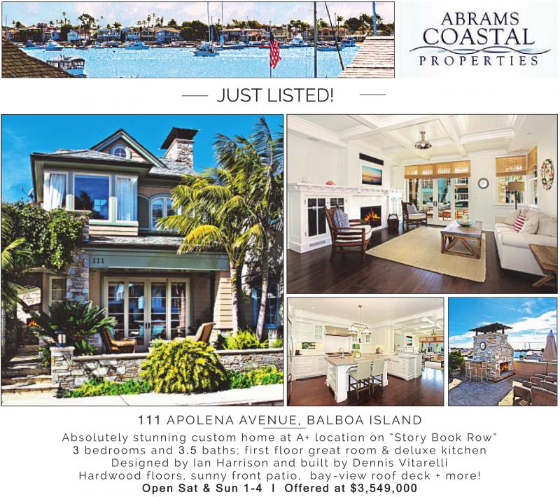 JUST LISTED! 111 APO LENA AVEN UE, BALBOA ISLAND Absolutely stunning custom home at A+ location on “Story Book Row” 3 bedrooms and 3.5 baths; first floor great room & deluxe kitchen Designed by Ian Harrison and built by Dennis Vitarelli Hardwood floors, sunny front patio, bay view roof deck + more! Open Sat & Sun 1 -4 I Offered at $3,549,000