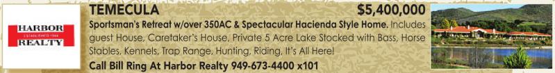 TEMECULA $5,400,000 Sportsman’s Retreat w/over 350AC & Spectacular Hacienda Style Home. Includes S guest House, Caretaker’s House, Private 5 Acre Lake Stocked with Bass, Horse g Stables, Kennels, Trap Range, Hunting, Riding, It’s All Here! Call Bill Ring At Harbor Realty 949-673-4400 x101