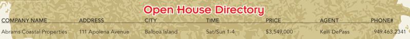 Abrams Coastal Properties 111 Apolena Avenue Balboa Island Sat/Sun 1-4 $3,549,000 Kelli DePass 949.463.2341