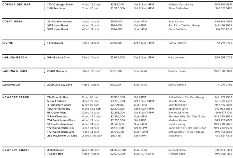 NEWPORT BEACH 214 Emerald Bay 5 bed | 6 bath $3,995,000 Sat 1-4PM Jeff Williams, Tim Carr Group 949 413 2559 5 Rue Fontaine 3 bed | 5 bath $3,295,000 Sat & Sun 1-4PM Jennifer Shaw 949 300 7409 4 Hampshire Court 6 bed | 6 bath $2,799,000 Sun 1-4PM Mike McKibben 949 422 3831 1812 Port Kimberly 5 bed | 3.5 bath $2,375,000 Sat & Sun 1-4PM Stephanie Lowe 949 933 5863 56 Ocean Vista 3 bed | 3 bath $2,295,000 Sat & Sun 1-4PM Jamie McKinnon 949 677 1021 2 Rue Chamonix 4 bed | 3.5 bath $2,295,000 Sun 1-4PM Branden Fella, Tim Carr Group 949 290 9625 734 Saint James Place 4 bed | 3 bath $2,250,000 Sat 1-4PM Marlene Hassel 949 422 6661 10 Rue Fontainbleau 4 bed | 3 bath $1,849,000 Sun 1-4PM Natalie Raney 949 290 9625 1721 Candlestick Lane 4 bed | 3 bath $1,795,000 Sat 11-2PM Robin Chesnie, Tim Carr Group 949 230 0550 1721 Candlestick Lane 4 bed | 3 bath $1,795,000 Sun 11-2PM Jeff Williams, Tim Carr Group 949 413 2559 286 Mayflower Dr. #286 2 bed | 1.75 bath $99,488 Sat 1-4PM Mike Postil 949 531 4378