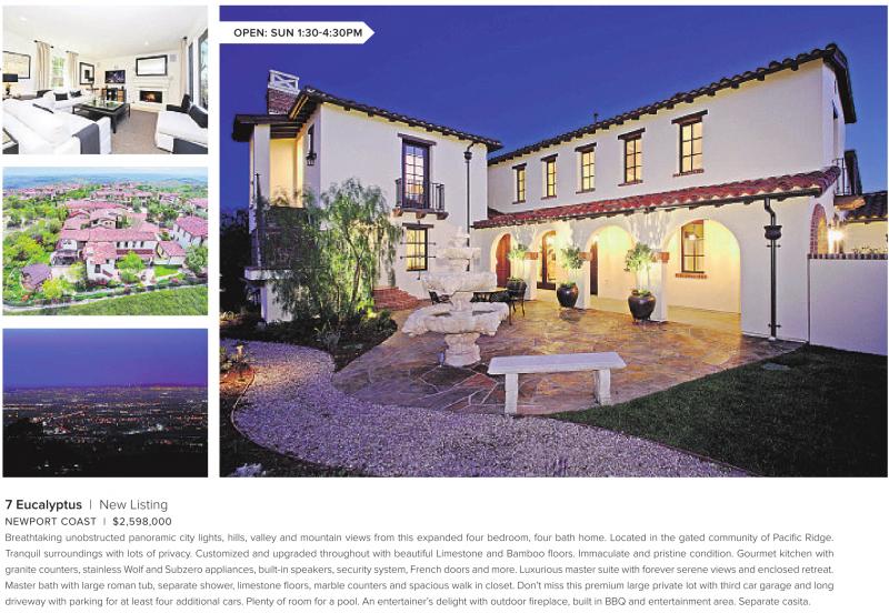 OPEN: SUN 1:30-4:30PM 7 Eucalyptus | New Listing NEWPORT COAST | $2,598,000 Breathtaking unobstructed panoramic city lights, hills, valley and mountain views from this expanded four bedroom, four bath home. Located in the gated community of Pacific Ridge. Tranquil surroundings with lots of privacy. Customized and upgraded throughout with beautiful Limestone and Bamboo floors. Immaculate and pristine condition. Gourmet kitchen with granite counters, stainless Wolf and Subzero appliances, built-in speakers, security system, French doors and more.Luxurious master suite with forever serene views and enclosed retreat. Master bath with large roman tub, separate shower, limestone floors, marble counters and spacious walk in closet. Don’t miss this premium large private lot with third car garage and long driveway with parking for at least four additional cars. Plenty of room for a pool. An entertainer’s delight with outdoor fireplace, built in BBQ and entertainment area. Separate casita.