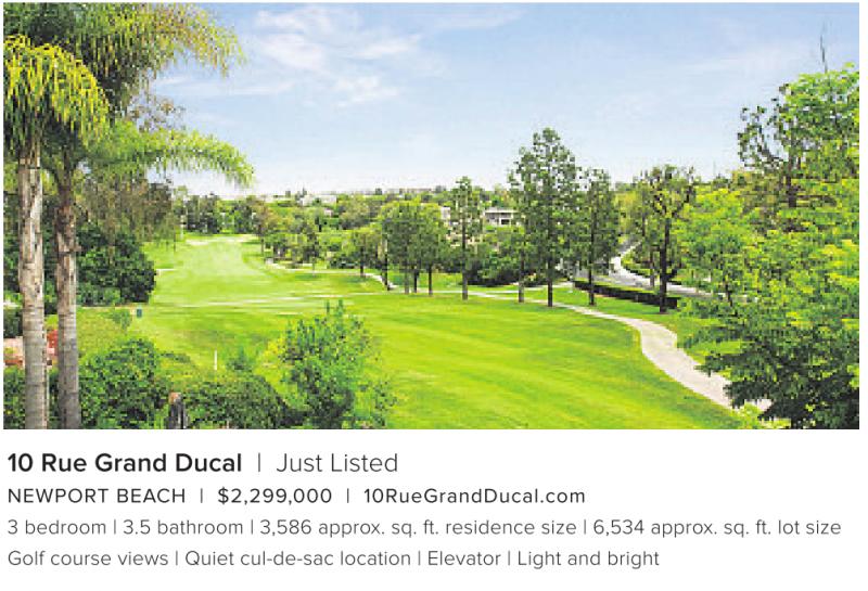 10 Rue Grand Ducal | Just Listed NEWPORT BEACH | $2,299,000 | 10RueGrandDucal.com 3 bedroom | 3.5 bathroom | 3,586 approx. sq. ft. residence size | 6,534 approx. sq. ft. lot size Golf course views | Quiet cul-de-sac location | Elevator | Light and bright