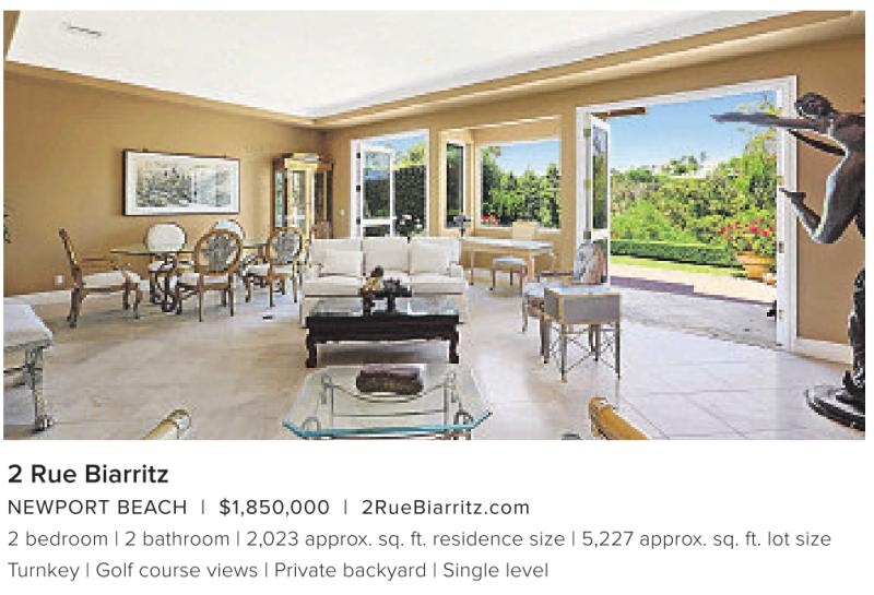 NEWPORT BEACH | $1,850,000 | 2RueBiarritz.com 2 bedroom | 2 bathroom | 2,023 approx. sq. ft. residence size | 5,227 approx. sq. ft. lot size Turnkey | Golf course views | Private backyard | Single level
