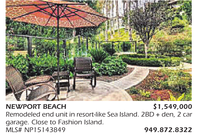 NEWPORT BEACH $1,549,000 Remodeled end unit in resort-like Sea Island. 2BD +den, 2car garage. Close to Fashion Island. MLS# NP15143849 949.872.8322