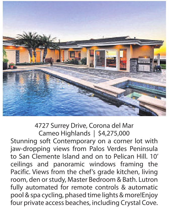 4727 Surrey Drive, Corona del Mar Cameo Highlands | $4,275,000 Stunning soft Contemporary on a corner lot with jaw-dropping views from Palos Verdes Peninsula to San Clemente Island and on to Pelican Hill. 10’ ceilings and panoramic windows framing the Pacific. Views from the chef’s grade kitchen, living room, den or study,Master Bedroom &Bath. Lutron fully automated for remote controls & automatic pool &spa cycling,phased time lights &more!Enjoy four privateaccess beaches,including Crystal Cove.
