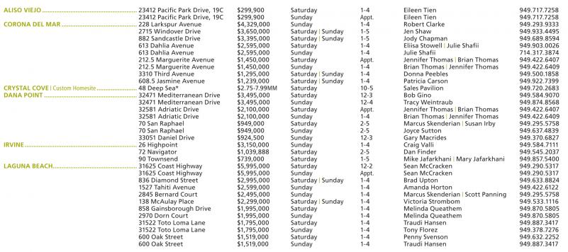 ALISO VIEJO ...................................................... 23412 Pacific Park Drive, 19C $299,900 Saturday 1-4 Eileen Tien 949.717.7258 23412 Pacific Park Drive, 19C $299,900 Sunday Appt. Eileen Tien 949.717.7258 CORONA DEL MAR........................................... 228 Larkspur Avenue $4,329,000 Sunday 1-4 Robert Clarke 949.293.9333 2715 Windover Drive $3,650,000 Saturday | Sunday 1-5 Jen Shaw 949.933.4495 882 Sandcastle Drive $3,395,000 Saturday | Sunday 1-5 Jody Chapman 949.689.8594 613 Dahlia Avenue $2,595,000 Saturday 1-4 Eliisa Stowell | Julie Shafii 949.903.0026 613 Dahlia Avenue $2,595,000 Sunday 1-4 Julie Shafii 714.317.3874 212.5 Marguerite Avenue $1,450,000 Saturday Appt. Jennifer Thomas | Brian Thomas 949.422.6407 212.5 Marguerite Avenue $1,450,000 Sunday 1-4 Brian Thomas | Jennifer Thomas 949.422.6409 3310 Third Avenue $1,295,000 Saturday | Sunday 1-4 Donna Peebles 949.500.1858 608.5 Jasmine Avenue $1,239,000 Saturday | Sunday 1-4 Patricia Carson 949.922.7399 CRYSTAL COVE | Custom Homesite....................... 48 Deep Sea* $2.75-7.99MM Saturday 10-5 Sales Pavilion 949.720.2683 DANA POINT..................................................... 32471 Mediterranean Drive $3,495,000 Saturday 12-3 Bob Gino 949.584.9070 32471 Mediterranean Drive $3,495,000 Sunday 12-4 Tracy Weintraub 949.874.8568 32581 Adriatic Drive $2,100,000 Saturday Appt. Jennifer Thomas | Brian Thomas 949.422.6407 32581 Adriatic Drive $2,100,000 Sunday 1-4 Brian Thomas | Jennifer Thomas 949.422.6409 70 San Raphael $949,000 Saturday 2-5 Marcus Skenderian | Susan Irby 949.295.5758 70 San Raphael $949,000 Sunday 2-5 Joyce Sutton 949.637.4839 33051 Daniel Drive $924,500 Sunday 12-3 Gary Macrides 949.370.6827 IRVINE................................................................ 26 Highpoint $3,150,000 Sunday 1-4 Craig Valli 949.584.7111 72 Navigator $1,039,888 Saturday 2-5 Dan Finder 949.545.2037 90 Townsend $739,000 Saturday 1-5 Mike Jafarkhani | Mary Jafarkhani 949.857.5400 LAGUNA BEACH................................................ 31625 Coast Highway $5,995,000 Saturday 12-2 Sean McCracken 949.290.5317 31625 Coast Highway $5,995,000 Sunday Appt. Sean McCracken 949.290.5317 836 Diamond Street $2,995,000 Saturday | Sunday 1-4 Brad Upton 949.633.8824 1527 Tahiti Avenue $2,599,000 Sunday 1-4 Amanda Horton 949.422.6122 2845 Bernard Court $2,495,000 Sunday 1-4 Marcus Skenderian | Scott Panning 949.295.5758 138 McAulay Place $2,299,000 Saturday | Sunday 1-4 Victoria Strombom 949.533.1116 858 Gainsborough Drive $1,995,000 Saturday 1-4 Melinda Queathem 949.870.5805 2970 Dorn Court $1,995,000 Sunday 1-4 Melinda Queathem 949.870.5805 31522 Toto Loma Lane $1,795,000 Saturday 1-4 Traudi Hansen 949.887.3417 31522 Toto Loma Lane $1,795,000 Sunday 1-4 Tony Florez 949.378.7276 600 Oak Street $1,519,000 Saturday 1-4 Penny Svenson 949.632.2252 600 Oak Street $1,519,000 Sunday 1-4 Traudi Hansen 949.887.3417