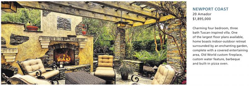 NEWPORT COAST 20 Amador $1,895,000 Charming four bedroom, three bath Tuscan-inspired villa. One of the largest floor plans available, home boasts indoor-outdoor retreat surrounded by an enchanting garden, complete with a covered entertaining area, Old World custom fireplace, custom water feature, barbeque and built-in pizza oven. See also