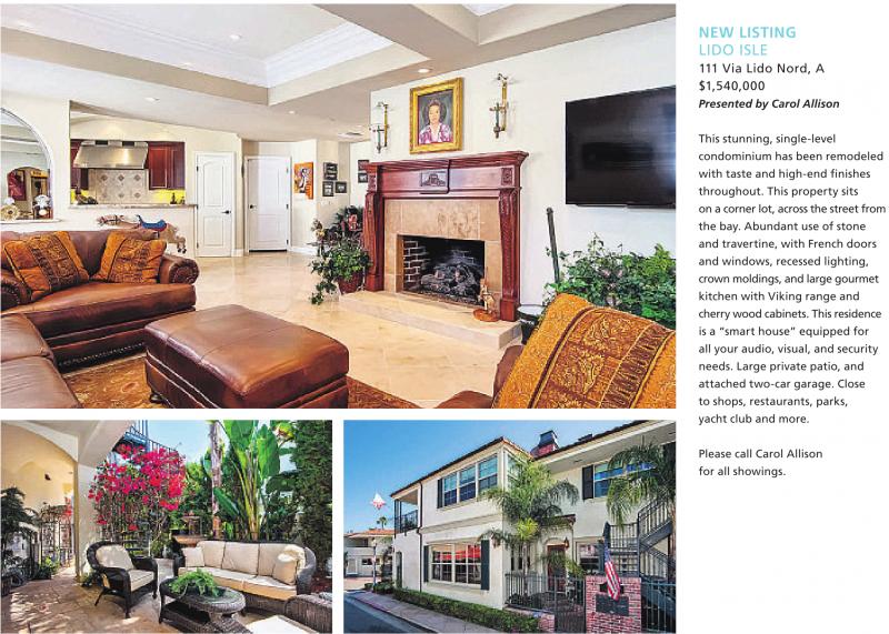 NEW LISTING LIDO ISLE 111 Via Lido Nord, A $1,540,000 Presented by Carol Allison This stunning, single-level condominium has been remodeled with taste and high-end finishes throughout. This property sits on acornerlot,acrossthe streetfrom the bay. Abundant use of stone and travertine, with French doors and windows, recessed lighting, crownmoldings, andlarge gourmet kitchen with Viking range and cherry wood cabinets.Thisresidence is a “smart house” equipped for all your audio, visual, and security needs. Large private patio, and attached two-car garage. Close to shops, restaurants, parks, yacht club and more. Please call Carol Allison for all showings. See also