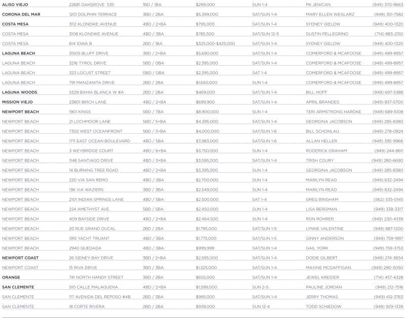 LAGUNA BEACH 323 LOCUST STREET 0BD / 0BA $2,395,000 SAT 1-4 COMERFORD & MCAFOOSE (949) 499-8957 LAGUNA BEACH 791 MANZANITA DRIVE 2BD / 2BA $1,650,000 SUN 1-4 COMERFORD & MCAFOOSE (949) 499-8957 LAGUNA WOODS 5329 BAHIA BLANCA W #A 2BD / 2BA $469,000 SAT/SUN 1-4 BILL HOFF (949) 697-5388 MISSION VIEJO 23801 BIRCH LANE 4BD / 2+BA $699,900 SAT/SUN 1-4 APRIL BRANDES (949) 837-5700 NEWPORT BEACH 1901 KINGS 5BD / 7BA $8,900,000 SUN 1-4 TERI ARMSTRONG HARDKE (949) 689-1008 NEWPORT BEACH 21 LOCHMOOR LANE 5BD / 5+BA $4,395,000 SAT/SUN 1-4 GEORGINA JACOBSON (949) 285-8380 NEWPORT BEACH 7302 WEST OCEANFRONT 5BD / 3+BA $4,000,000 SAT/SUN 1-6 BILL SCHONLAU (949) 278-0824 NEWPORT BEACH 1711 EAST OCEAN BOULEVARD 4BD / 5BA $3,983,000 SAT/SUN 1-6 ALLAN HELLER (949) 395-9966 NEWPORT BEACH 3 WEYBRIDGE COURT 4BD / 6+BA $3,750,000 SUN 1-4 RODERICK GRAHAM (949) 244-8611 NEWPORT BEACH 1148 SANTIAGO DRIVE 4BD / 3+BA $3,595,000 SAT/SUN 1-4 TRISH COURY (949) 280-6690 NEWPORT BEACH 14 BURNING TREE ROAD 4BD / 2+BA $3,395,000 SUN 1-4 GEORGINA JACOBSON (949) 285-8380 NEWPORT BEACH 220 VIA SAN REMO 4BD / 3BA $2,700,000 SUN 1-4 MARILYN READ (949) 632-2494 NEWPORT BEACH 136 VIA WAZIERS 3BD / 3BA $2,549,000 SUN 1-4 MARILYN READ (949) 632-2494 NEWPORT BEACH 2101 INDIAN SPRINGS LANE 4BD / 5BA $2,500,000 SAT 1-4 GREG BINGHAM (562) 335-0145 NEWPORT BEACH 224 AMETHYST AVE. 5BD / 5BA $2,450,000 SUN 1-4 LISA BERGMAN (949) 338-3317 NEWPORT BEACH 409 BAYSIDE DRIVE 4BD / 2+BA $2,464,500 SUN 1-4 RON ROHRER (949) 230-4339 NEWPORT BEACH 20 RUE GRAND DUCAL 2BD / 2BA $1,795,000 SAT/SUN 1-5 LYNNE VALENTINE (949) 887-1200 NEWPORT BEACH 1915 YACHT TRUANT 4BD / 3BA $1,775,000 SAT/SUN 1-5 GINNY ANDERSON (949) 759-1997 NEWPORT BEACH 2940 QUEDADA 4BD / 3BA $999,999 SAT/SUN 1-4 GAIL YORK (949) 759-3753 NEWPORT COAST 26 SIDNEY BAY DRIVE 3BD / 2+BA $2,595,000 SAT/SUN 1-4 DODIE GILBERT (949) 274-3654 NEWPORT COAST 15 RIVA DRIVE 3BD / 3BA $1,525,000 SAT/SUN 1-4 MAXINE MCGAFFIGAN (949) 290-5050 ORANGE 741 NORTH HANDY STREET 3BD / 2BA $655,000 SAT/SUN 1-4 JEWEL KREIDER (714) 457-4328 SAN CLEMENTE 510 CALLE MALAGUENA 4BD / 2+BA $1,599,000 SUN 2-5 PAULINE JORDAN (949) 212-7516 SAN CLEMENTE 117 AVENIDA DEL REPOSO #4B 2BD / 3BA $995,000 SAT/SUN 1-4 JERRY THOMAS (949) 412-3763 SAN CLEMENTE 18 CORTE RIVERA 2BD / 2BA $939,000 SUN 12-4 TODD SCHIEDOW (949) 929-1339