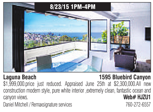Laguna Beach 1595 Bluebird Canyon $1,999,000.price just reduced. Appraised June 25th at $2,300,000.All new constructionmodern style, pure whiteinterior ,extremely clean, fantastic ocean and canyon views. Web# HJZU1 Daniel Mitchell /Remaxsignatureservices 760-272-6557