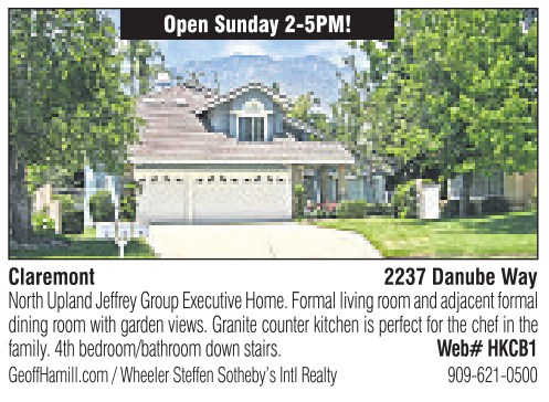 Open Sunday 2-5PM! Claremont 2237 Danube Way North Upland Jeffrey Group Executive Home. Formal living room and adjacent formal dining room with garden views. Granite counterkitchen is perfectfor thechef in the family.4th bedroom/bathroom downstairs. Web# HKCB1 GeoffHamill.com /Wheeler Steffen Sotheby’s Intl Realty 909-621-0500 See also