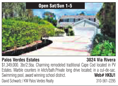 Open Sat/Sun 1-5 Palos Verdes Estates 3024 Via Rivera $1,349,000. 3br/2.5ba. Charming remodeled traditional Cape Cod located in PV Estates. Marble counters in kitch/bath.Private long drive located; inacul-de-sac. Swimming pool, award winning school district. Web# HKBJ1 David Schwartz /KWPalos Verdes Realty 310-561-2295