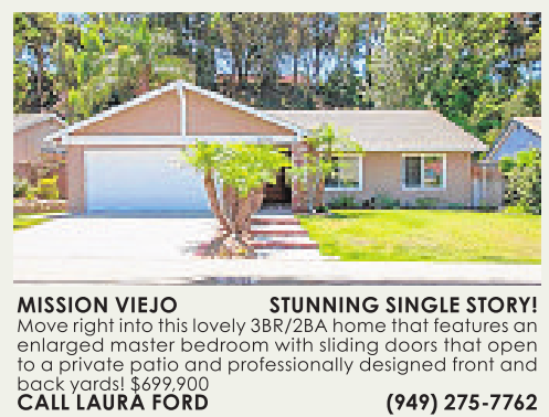 315-9326 MISSION VIEJO STUNNING SINGLE STORY! Move rightintothis lovely 3BR/2BAhome that features an enlarged master bedroom with sliding doors that open to aprivate patio and professionally designed front and back yards! $699,900 CALL LAURA FORD (949) 275-7762