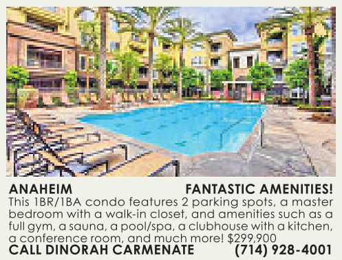 ANAHEIM FANTASTIC AMENITIES! This 1BR/1BA condo features 2parking spots, amaster bedroom with awalk-in closet, and amenities such asa full gym, asauna, apool/spa, aclubhousewithakitchen, aconference room, and much more! $299,900 CALL DINORAH CARMENATE (714) 928-4001