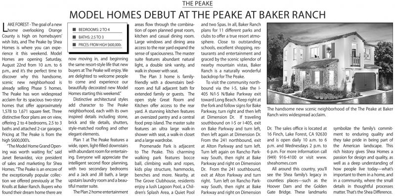 “The Model Home Grand Opening was worth waiting for,” said Janet Benavidez, vice president of sales and marketing for shea Homes.“ThePeake is an encoreof the exceptionally popular collection we offered previously at The Knolls at Bakerranch. Buyers who found their dream home thereare
