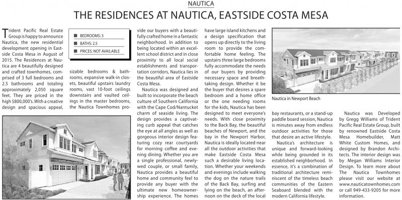 nautica was developed by Gregg williams of Trident Pacific real estate Group,built by renowned eastside Costa mesa Homebuilder, matt white Custom Homes, and designed by Brandon architects. The interior design was by megan williams interior design. To learn more about The nautica Townhomes please visit our website at www.nauticatownhomes.com or call 949-433-9205 for more information.