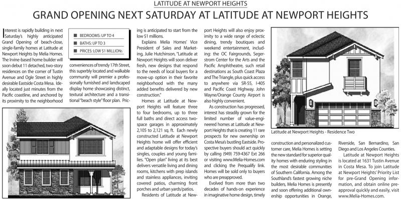 is rapidly building in next saturday’s highly anticipated Grand Opening of beach-close, single-family homes at Latitude at Newport HeightsbyMeliaHomes. TheIrvine-based home builder will soon debut 11 detached,two-story residences on the corner of Tustin Avenue and Ogle street in highly desirable Eastside Costa Mesa. Ideally located just minutes from the Pacific coastline, and anchored by its proximity to the neighborhood