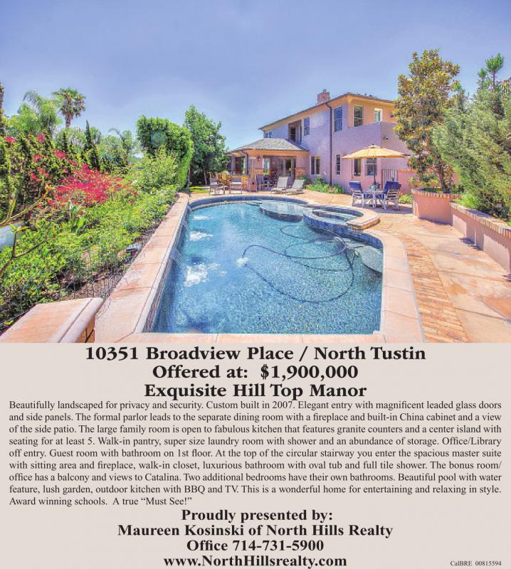 10351 Broadview Place / North Tustin Offered at: $1,900,000 Exquisite Hill Top Manor Beautifully landscaped for privacy and security. Custom built in 2007. Elegant entry with magnificent leaded glass doors and side panels.The formal parlor leads to the separate dining room with a fireplace and built-in China cabinet and a view of the side patio. The large family room is open to fabulous kitchen that features granite counters and a center island with seating for at least 5. Walk-in pantry, super size laundry room with shower and an abundance of storage. Office/Library off entry. Guest room with bathroom on 1st floor. At the top of the circular stairway you enter the spacious master suite with sitting area and fireplace, walk-in closet, luxurious bathroom with oval tub and full tile shower. The bonus room/ office has a balcony and views to Catalina.Two additional bedrooms have their own bathrooms. Beautiful pool with water feature, lush garden, outdoor kitchen with BBQ and TV. This is a wonderful home for entertaining and relaxing in style. Award winning schools. A true “Must See!” Proudly presented by: Maureen Kosinski of North Hills Realty Office 714-731-5900 www.NorthHillsrealty.com CalBRE 00815594