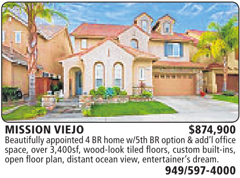 MISSION VIEJO $874,900 Beautifullyappointed 4BRhome w/5thBRoption&add’loffice space, over 3,400sf, wood-look tiled floors, custom built-ins, openfloorplan, distant ocean view,entertainer’s dream.