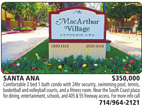 SANTA ANA $350,000 Comfortable 2bed 1bath condo with 24hr security, swimming pool, tennis, basketball and volleyball courts, andafitnessroom. Near theSouth Coastplaza fordining, entertainment, schools,and 405&55freeway access.For more infocall 714/964-2121