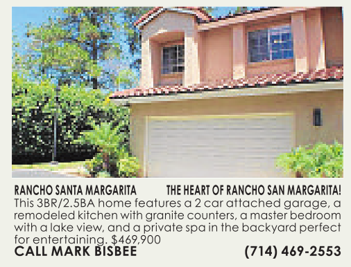 RANCHO SANTA MARGARITA THE HEART OFRANCHO SAN MARGARITA! This 3BR/2.5BAhomefeaturesa2car attached garage,a remodeled kitchenwith granitecounters,amaster bedroom with alakeview, andaprivate spainthe backyard perfect for entertaining. $469,900 CALL MARK BISBEE (714) 469-2553