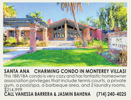 SANTA ANA CHARMING CONDO IN MONTEREY VILLAS! This 1BR/1BAcondo is very cozy andhas fantastic homeowner association privilegesthatincludetenniscourts, aprivate gym,apool/spa, abarbeque area,and 2laundry rooms. $214,999 CALL VANESSA BARRERA &JASMIN BAHENA (714) 240-4025 See also