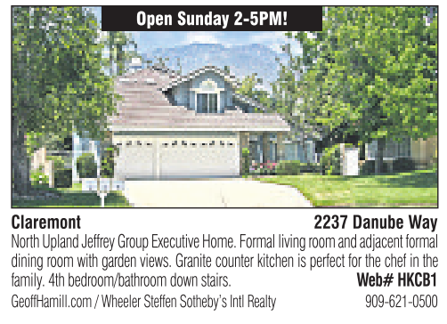 Open Sunday 2-5PM! GeoffHamill.com /Wheeler Steffen Sotheby’s Intl Realty 909-621-0500 Claremont 2237 Danube Way North Upland Jeffrey Group Executive Home. Formal living room and adjacent formal dining room with garden views. Granite counterkitchen is perfectfor thechef in the family.4th bedroom/bathroom downstairs. Web# HKCB1 See also