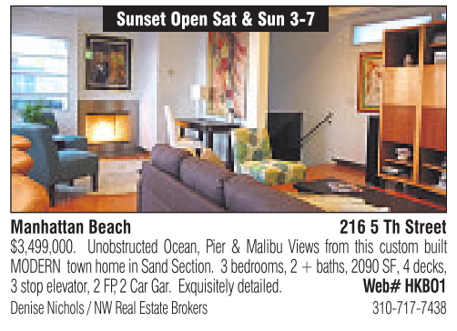 Manhattan Beach 216 5ThStreet $3,499,000. Unobstructed Ocean, Pier & Malibu Views from this custom built MODERN town home in SandSection. 3bedrooms, 2+baths, 2090 SF, 4decks, 3stop elevator,2FP, 2Car Gar. Exquisitely detailed. Web# HKBO1