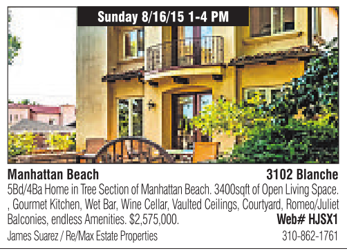 Manhattan Beach 3102 Blanche 5Bd/4Ba Home in Tree Section of ManhattanBeach. 3400sqft of Open Living Space. ,Gourmet Kitchen, WetBar,Wine Cellar,Vaulted Ceilings,Courtyard,Romeo/Juliet Balconies, endless Amenities.$2,575,000. Web# HJSX1 James Suarez /Re/Max Estate Properties 310-862-1761